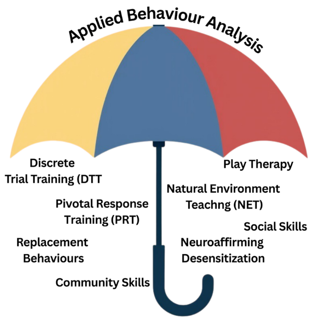 It is also important to understand that ABA is an umbrella term, referring to the overarching scientific approach to understanding and supporting behaviour. Under this umbrella are a variety of specific therapeutic methods and teaching strategies that all follow ABA principles but differ in how skills are taught and practiced.